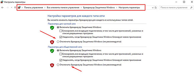 7. Должен быть выключен Брандмауэр Защитника Windows. Перейдите в Панель управления > Все элементы панели управления > Брандмауэр Защитника Windows > Настроить параметры. И в обоих пунктах выбираете параметр "Отключить".